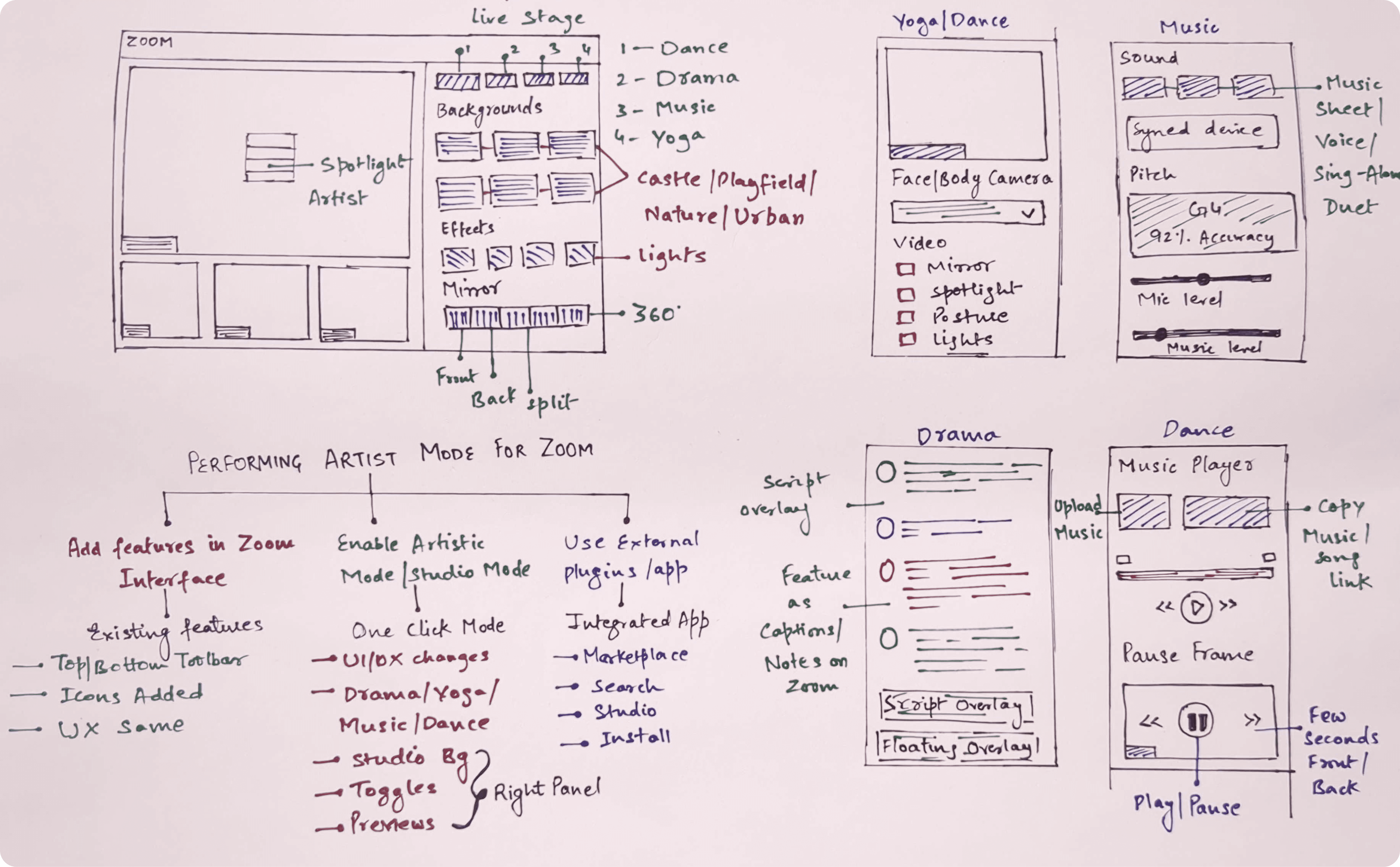 I collected all possible solutions by suggesting features that could help performing artists. I worked on each feature one by one, removed the ones that were not workable, and put my ideas on paper to make them easy to understand.