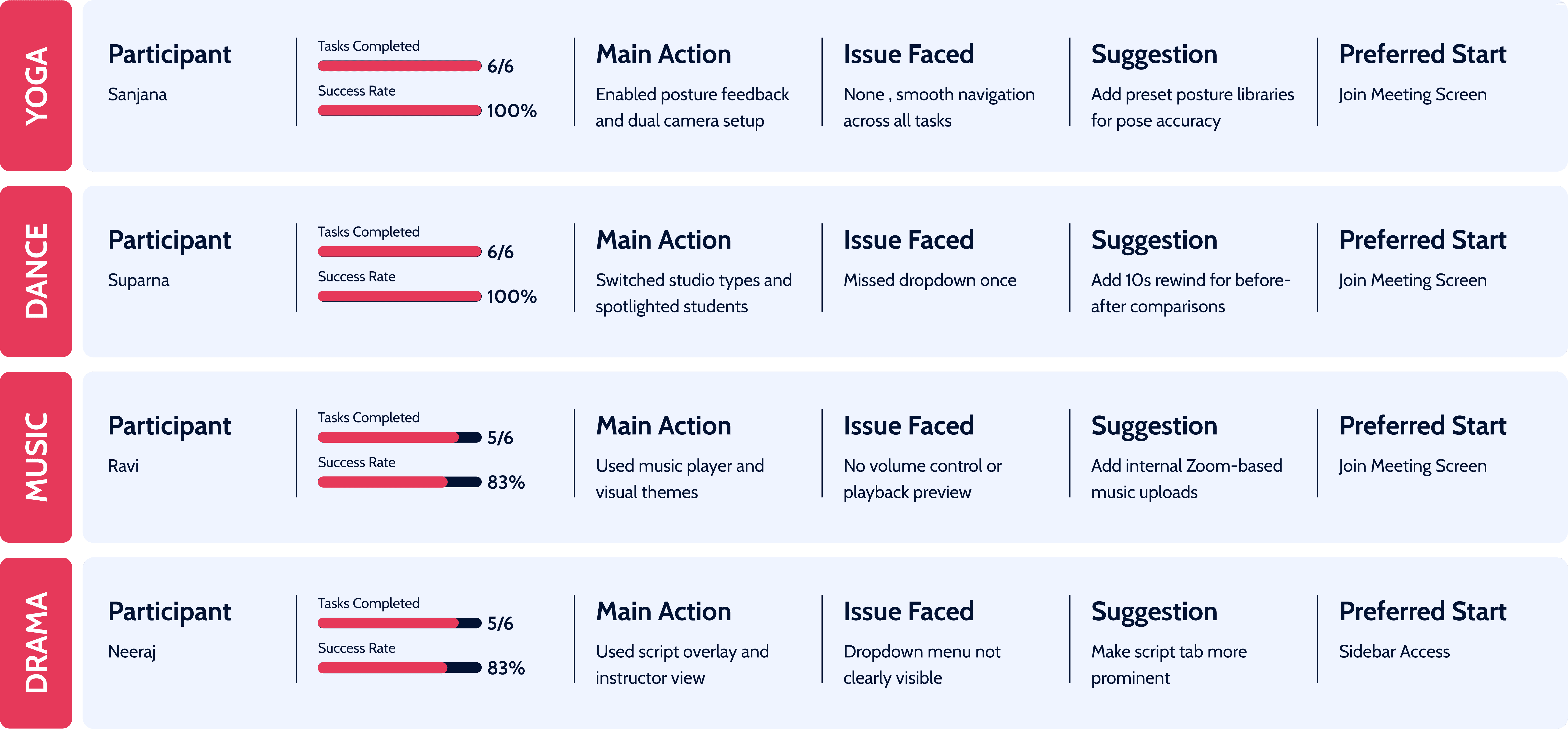 I observed their actions, noted any issues they faced, and asked about their preferred way to start and their suggestions. This table summarizes the feedback collected from 1:1 session for Artistic Studio features.