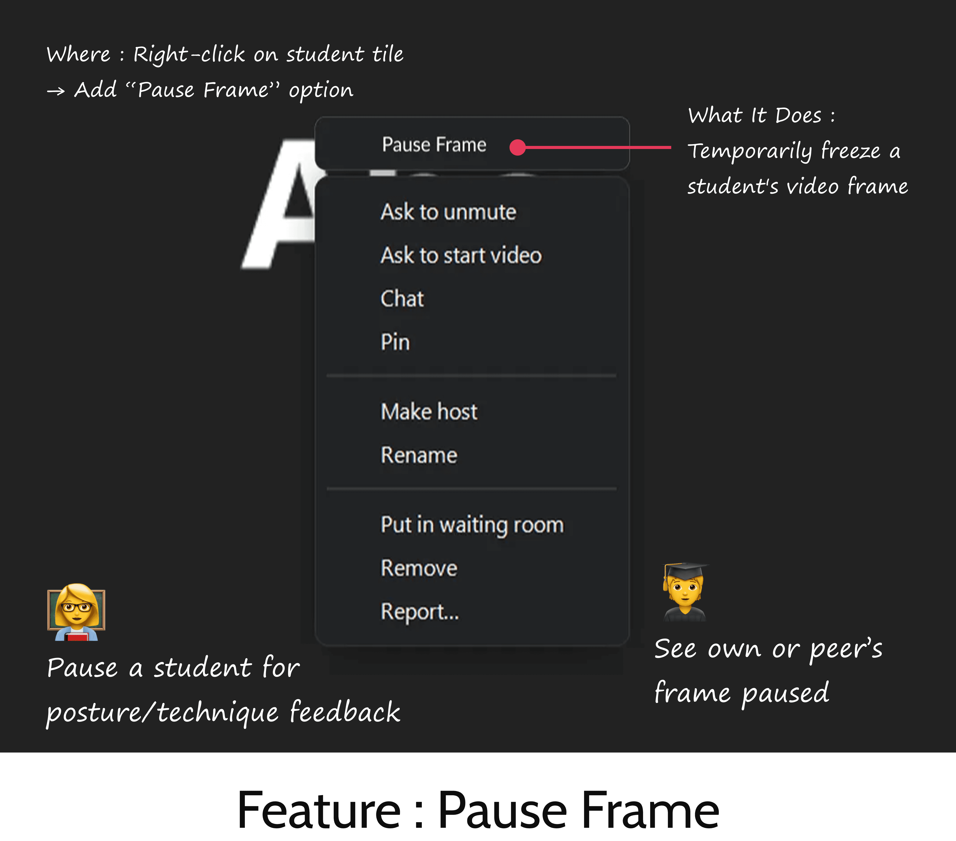 Zoom is made mainly for meetings and classrooms, not for creative classes. Teachers and students in fields like dance, yoga, music, and drama face many problems. There is audio delay, unclear video for movements, and not enough tools for creative feedback. These problems disturb the class flow, reduce learning quality, and make users use other difficult methods to manage classes.