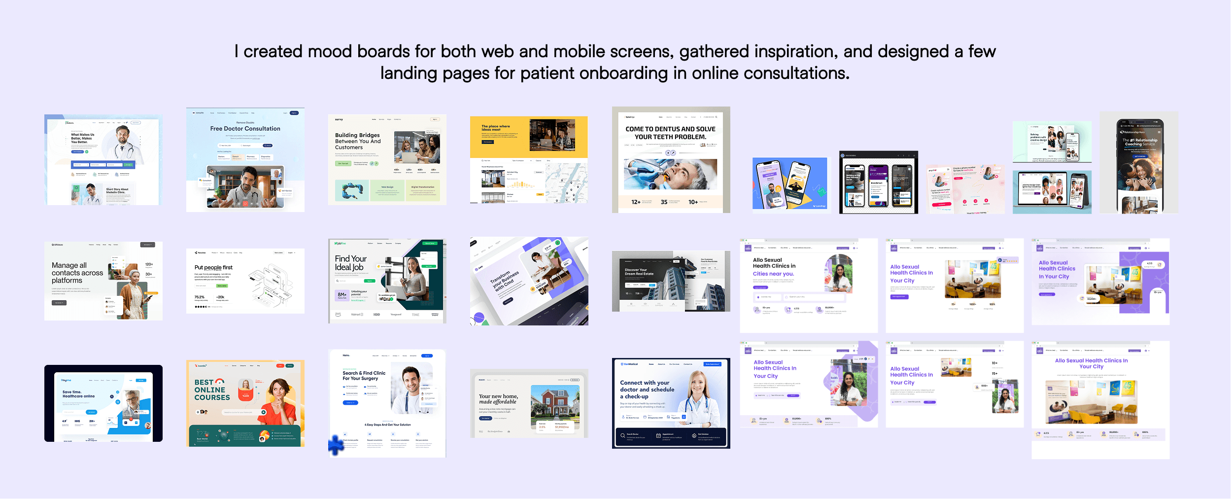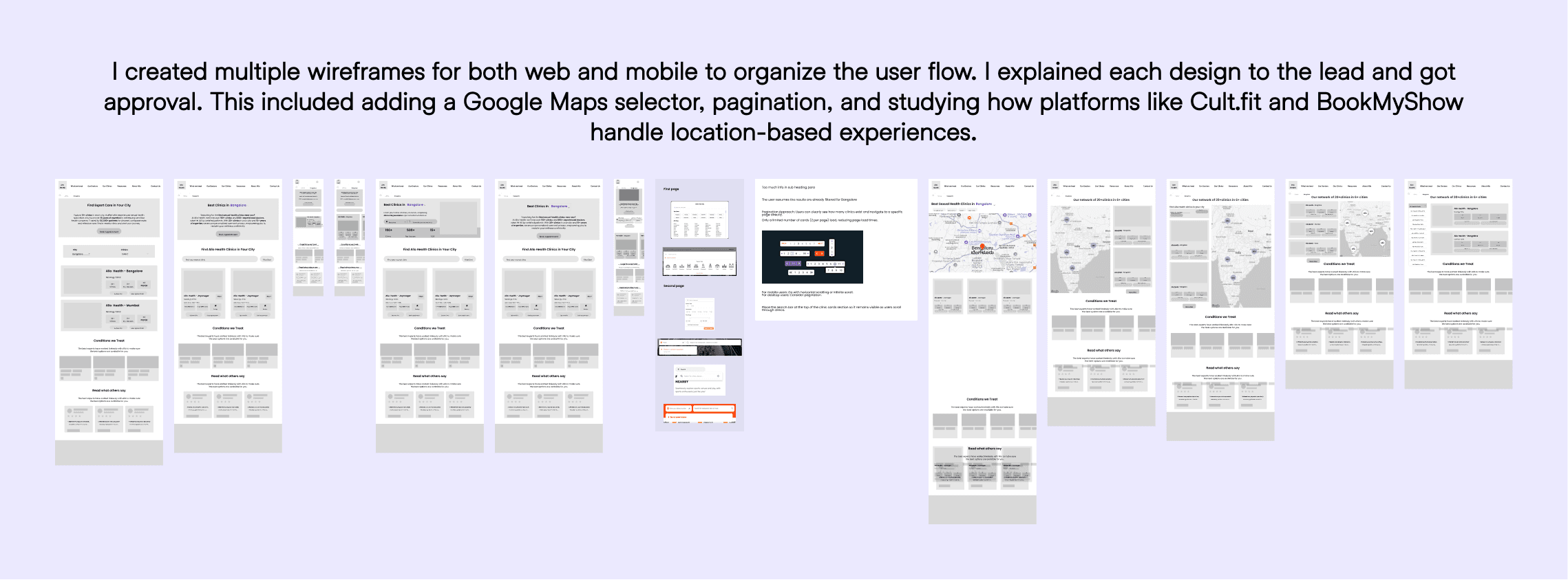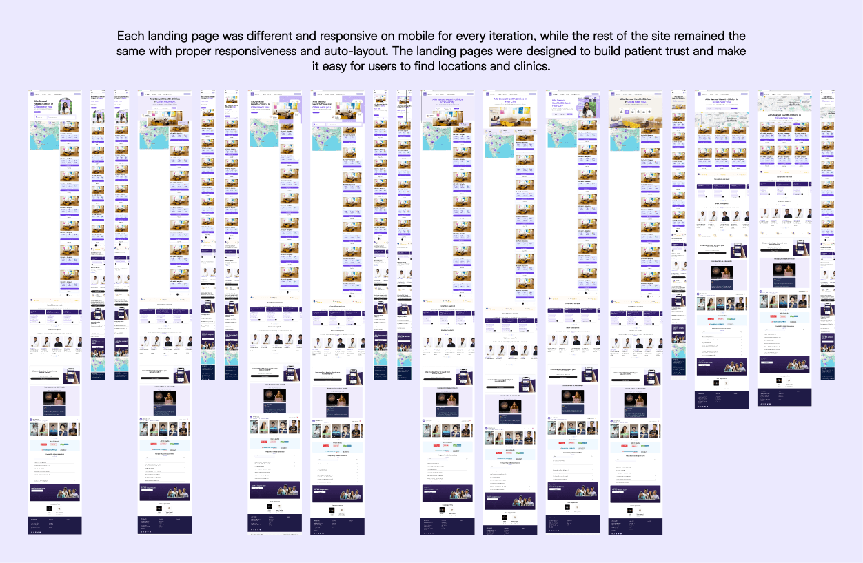 For the UI part, I designed 4–5 mid-fidelity wireframe variations for the website on both web and mobile, ensuring responsiveness. Finally, I created the high-fidelity designs and handed over the complete first-time patient experience.
